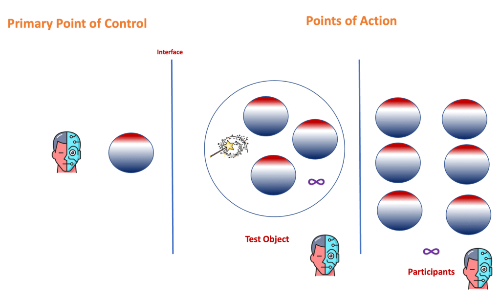 The sphere with the dual shade of red and blue shows you that a test has a small, partial relationship to the interface of a test object and in its logic flow it hits small, partial pieces in test object and participants. There is a need of test control everywhere for precise testing.