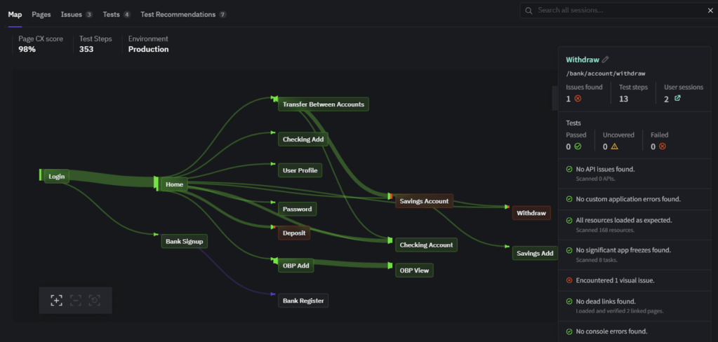 - Visual diffing is a strength of the product. However, that’s confined by design to the structural validation (e.g. navigation bars). For the data-centric apps of today, most of the app will be untested with this.