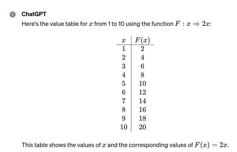 I wanted to put the assumption that I made in my last post to test, that Latex could be used for many more situations. The last post was about discovering how Latex can be used for formatting colour conditionally. So, the use case was for output customisation.Can we use Latex to define input?Here’s the prompt I gave to GPT-4 which is basic representation of a math function in Latex.Generate a value table for 1-10 by processing them through the following Latex: